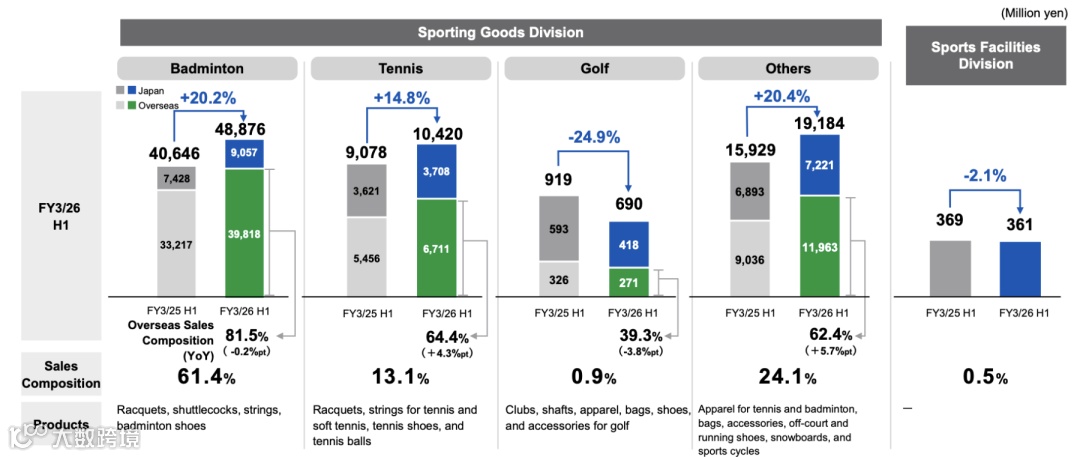 随着市场持续扩张,日本及海外市场的羽毛球销售额均有所增长(+20.2%); -