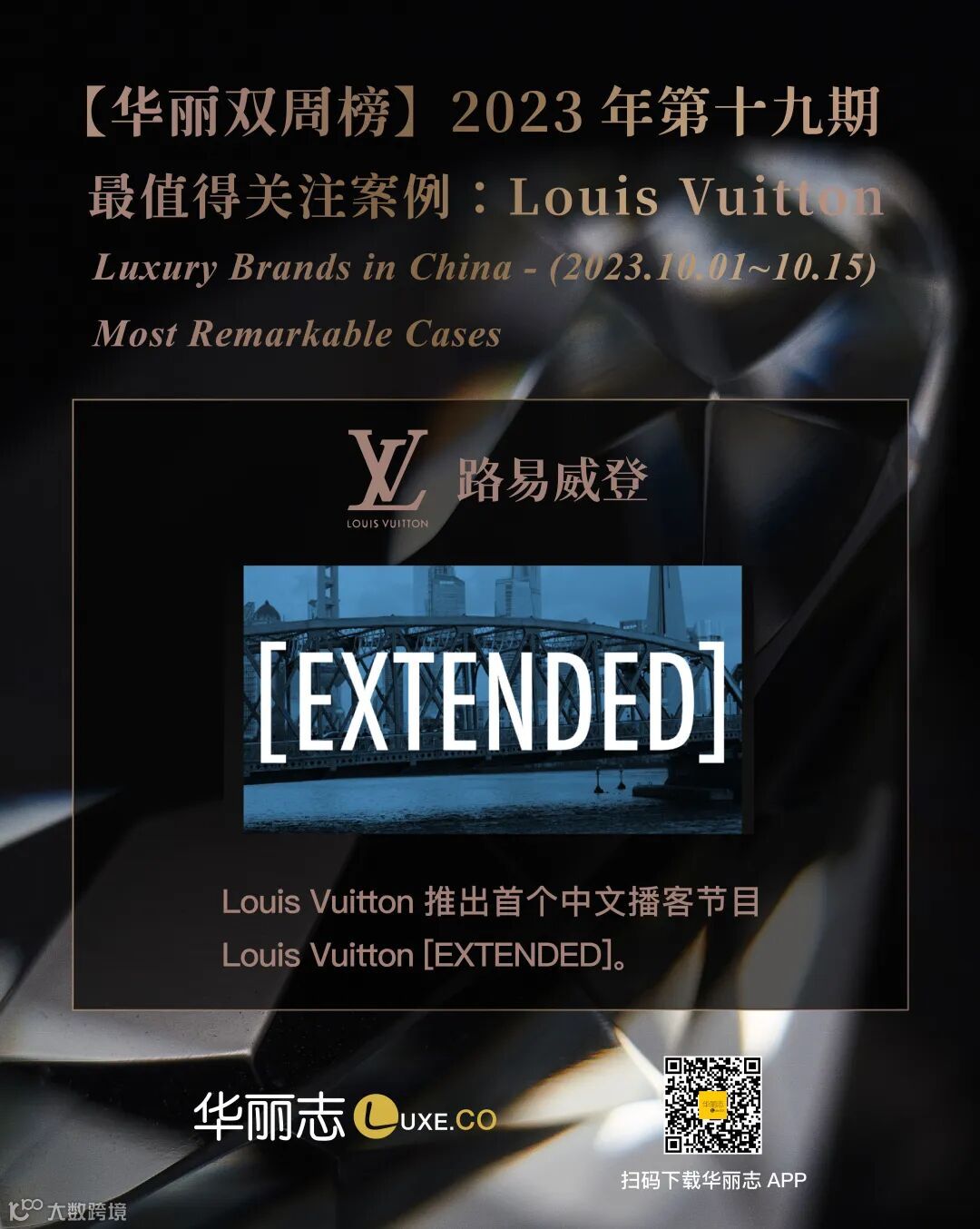 Louis Vuitton 在小宇宙推出首个中文播客节目 Louis Vuitton [EXTENDED],播客第一季围绕上海这座城市展开,从流动的苏州河记忆,到早餐摊上的四大金刚与西点房里的面包,嘉宾们畅聊他们在上海的有趣又动人的故事。目前已发布2期播客,时长在30-40分钟。