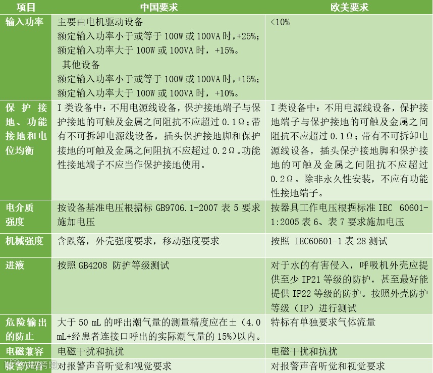 FDA对呼吸机的基本要求涵盖:保护接地、电介质强度、机械强度、防进液、危险输出防护、电磁兼容性(EMC)及报警声级等。