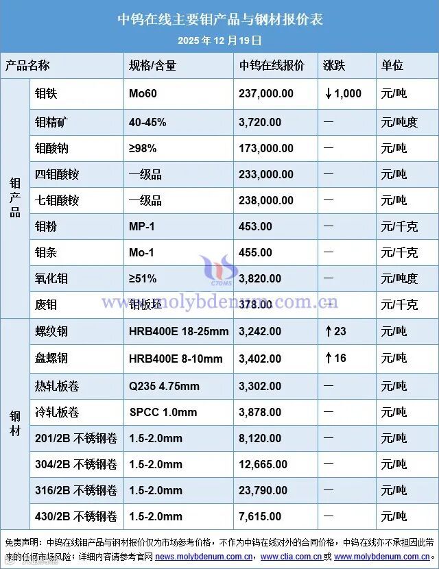 本周国内钼价整体呈窄幅震荡走势,除钼铁价格微跌1.25%之外,其余钼产品价格如钼精矿与钼酸钠价格均未发生明显变动。在此行情下,业者对后市信心一般,普遍预计短期内市场或继续维持平稳运行。