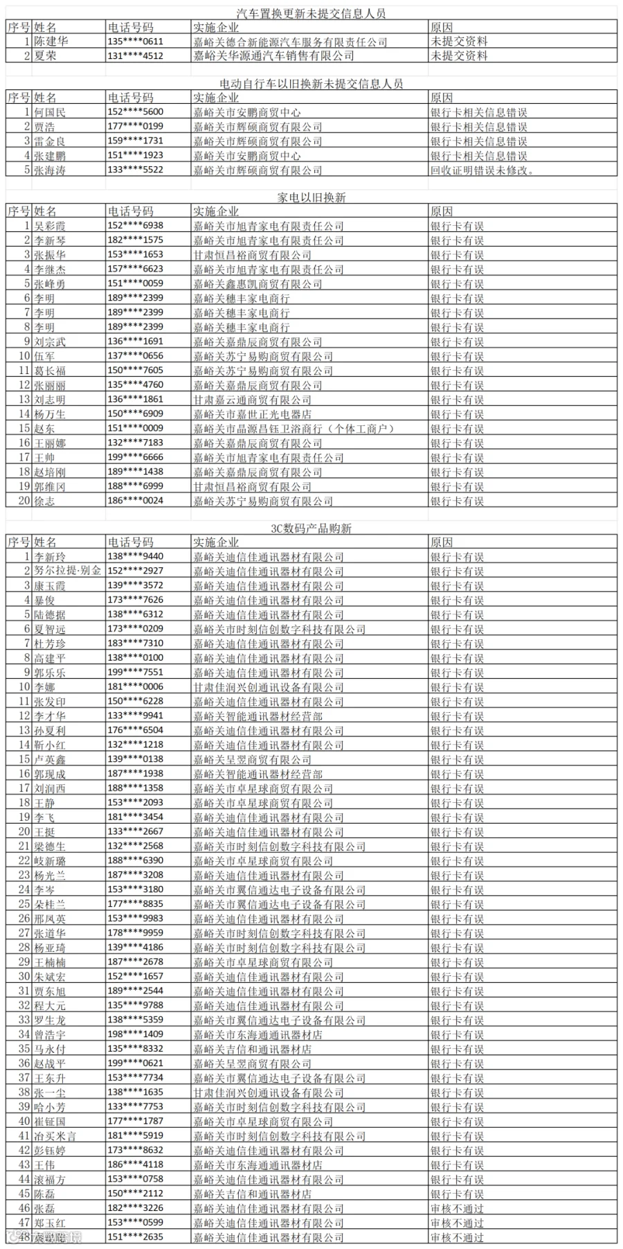 附件:嘉峪关市2025年消费品以旧换新银行信息错误名单
