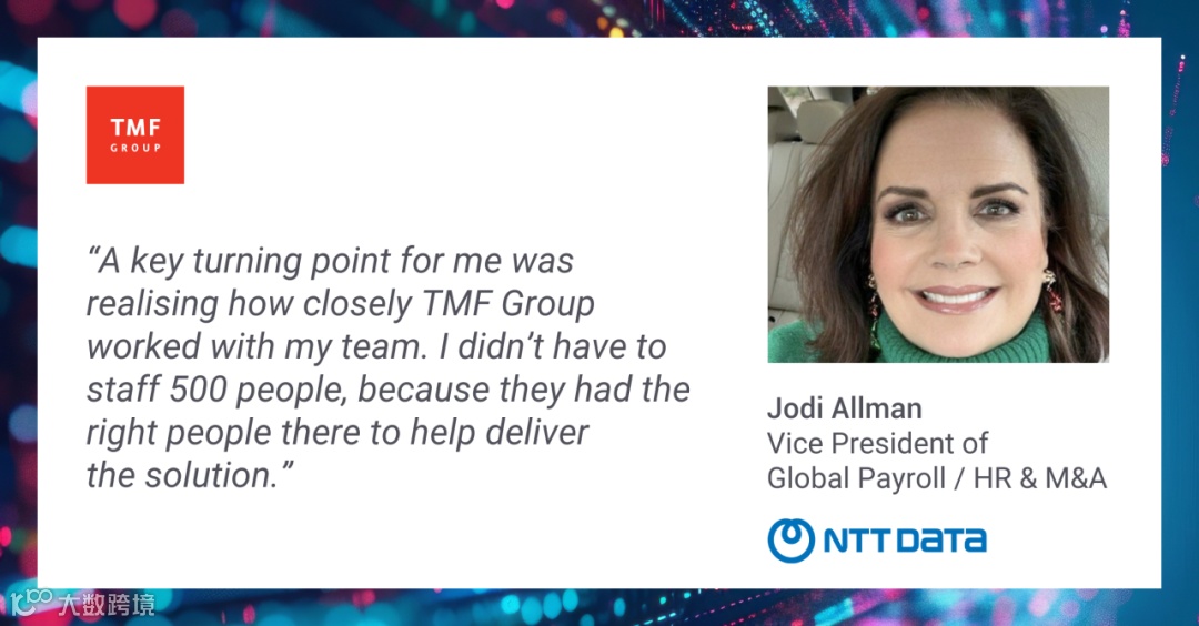 In 2017, some months after NTT DATA partnered with TMF Group to deliver a global payroll solution, Jodi Allman was appointed Vice President of Global Payroll / HR & M&A and became responsible for managing the partnership on behalf of NTT.