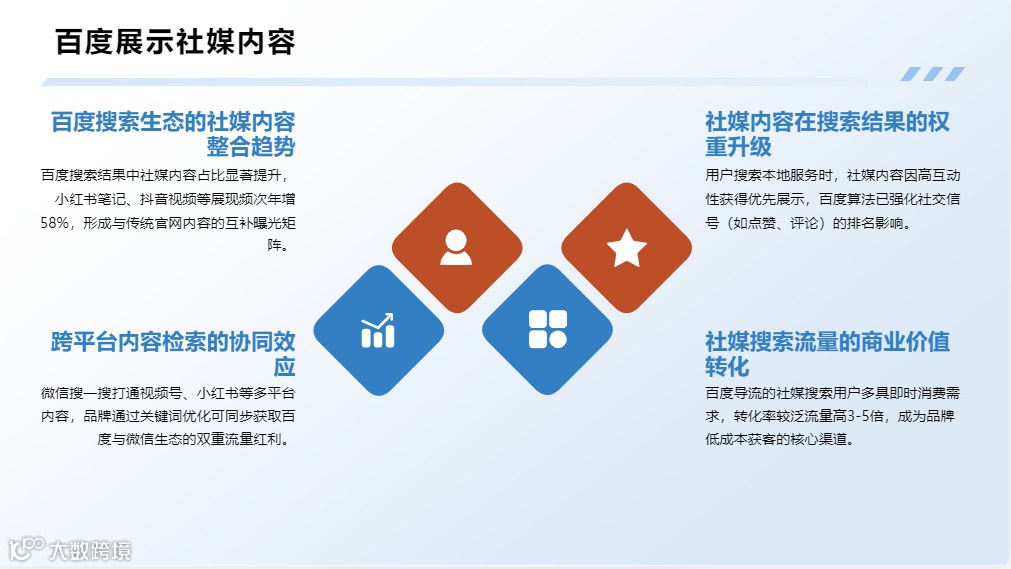 百度搜索结果中,小红书笔记、百家号文章、抖音视频的展现频次年增长58%,用户搜索 “本地服务+关键词”时,社媒内容与官网内容形成曝光互补;微信搜一搜已打通视频号、公众号、小红书内容检索,优化社媒账号名称、简介及内容关键词,可同步获取微信生态内的自然流量,大幅提升品牌全域可见度;