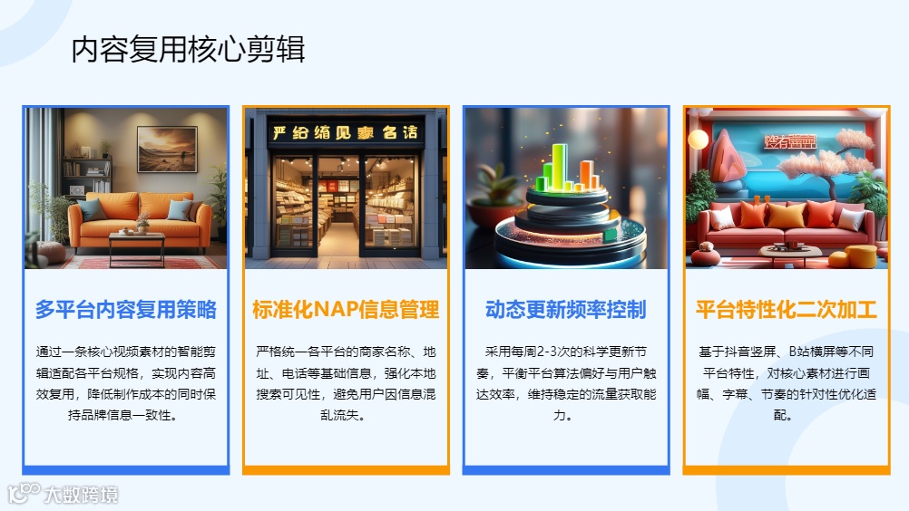 打破单平台局限,采用“内容复用策略”—1条核心视频剪辑适配多平台,保持每周2-3次更新频率,同时确保各平台“商家名称、地址、电话(NAP)”完全一致;