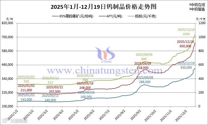 仲钨酸铵(APT)市场上,原料采购困难,加上年末例行检修,市场总体开工率降低,行情呈现货紧价俏态势。