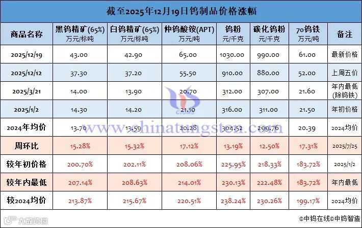 本周钨价强势抬升,主要钨原料价格周涨幅在12-18%左右,年内累计涨幅突破200%!