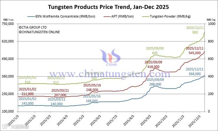 Ammonium paratungstate (APT) is priced at RMB 545,000/ton, up 158.3% from the beginning of the year.