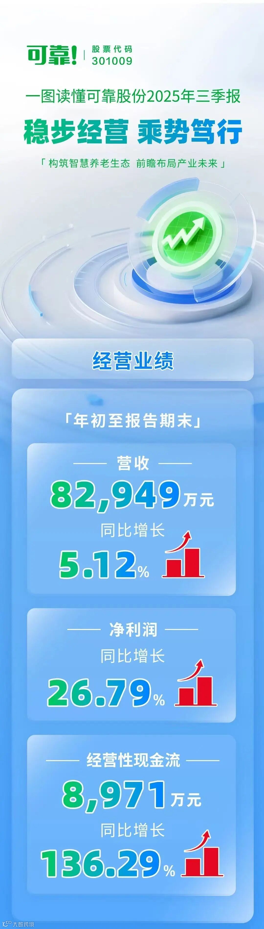 (快消品讯)昨日,可靠股份(301009.SZ)2025年三季报显示,年初至报告期末,营收82,949万元,同比增长5.12%;净利润同比增长26.79%;经营性现金流8,971万元,同比增长136.29%,在持续深耕智慧养老生态领域的同时,也在积极前瞻布局产业未来,为长期发展奠定坚实基础。