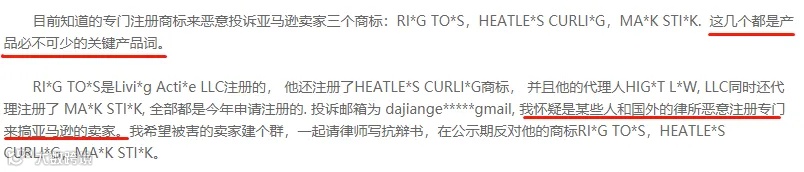 有关注到这种情况的卖家也曾发帖分享过抢注常用词商标的情况,并呼吁受害卖家建群,一起请律所写抗辩书,在公示期异议这些抢注商标。