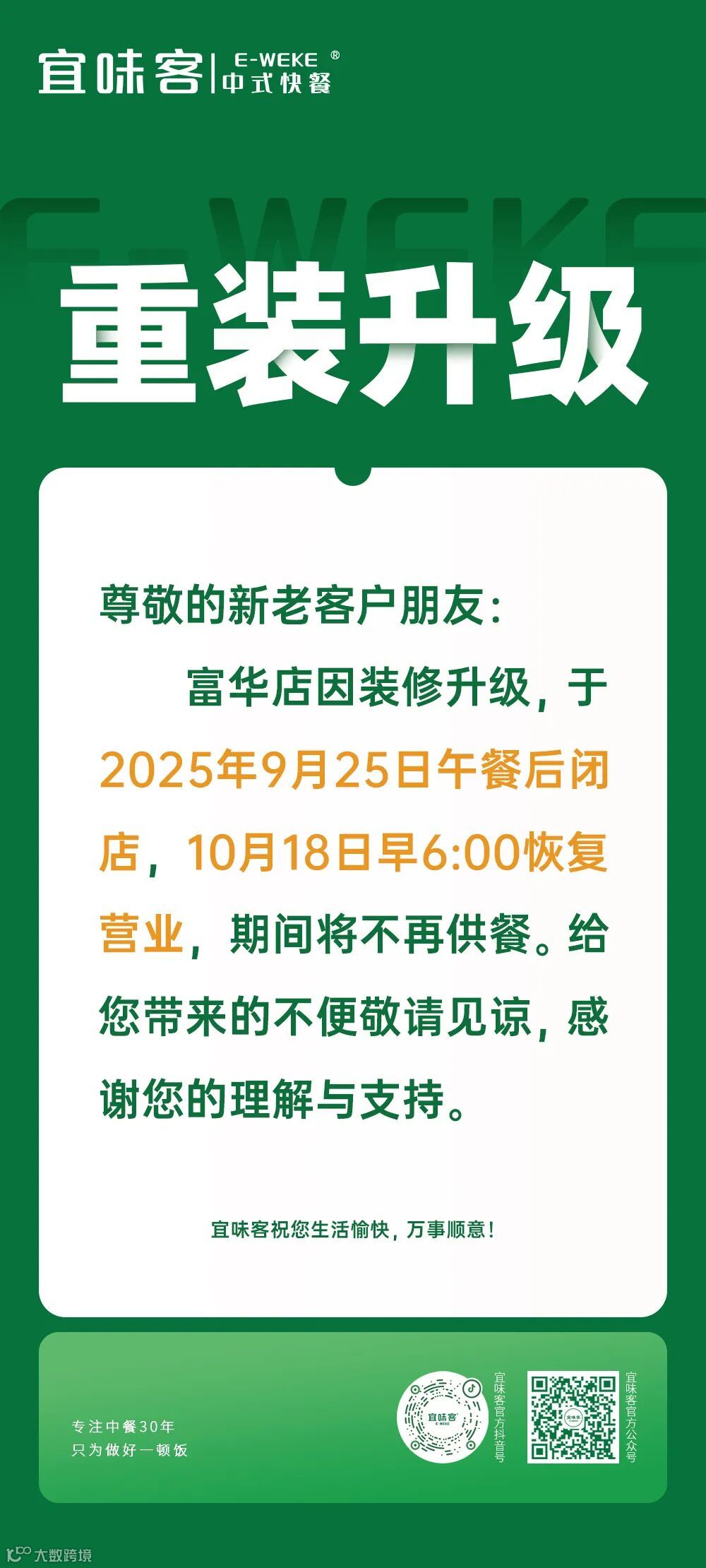 导读:富华路店重装升级公告:2025年9月25日午餐后闭店,10月18日早6:00恢复营业。