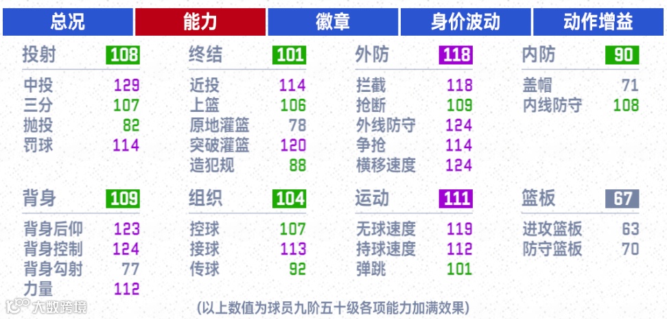 进攻端中距离大师,背身硬解利器:中投129:游戏中最顶级的中投数值之一,搭配其专属投篮包,中距离两分稳健如罚球。背身后仰123+背身控制124:配合翻身后仰动作包,使其在腰位接球后具备极强的单打终结能力,是阵地战打破僵局的可靠选择。