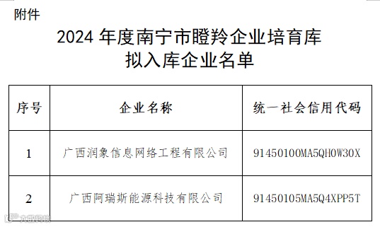 根据《南宁市人民政府关于培育瞪羚企业的实施意见》(南府规〔2020〕4号)、《关于开展2024年南宁市瞪羚企业入库培育遴选工作的通知》(南科通〔2024〕108号)文件精神,市科技局、市工信局共同组织开展2024年度南宁市瞪羚企业培育库入库企业遴选工作,经过专家评审、实地查验等程序,现将2024年度南宁市瞪羚企业培育库拟入库企业名单(见附件)予以公示,公示期为2025年1月2日至2025年1月8日(5个工作日)。