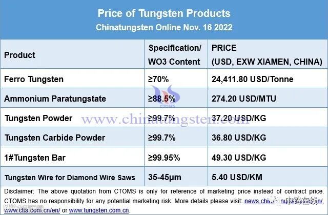 China’s tungsten powder and ammonium paratungstate (APT) prices are unchanged from the previous trading on November 15, 2022 as market participants are not active in trading.