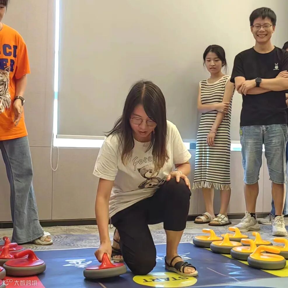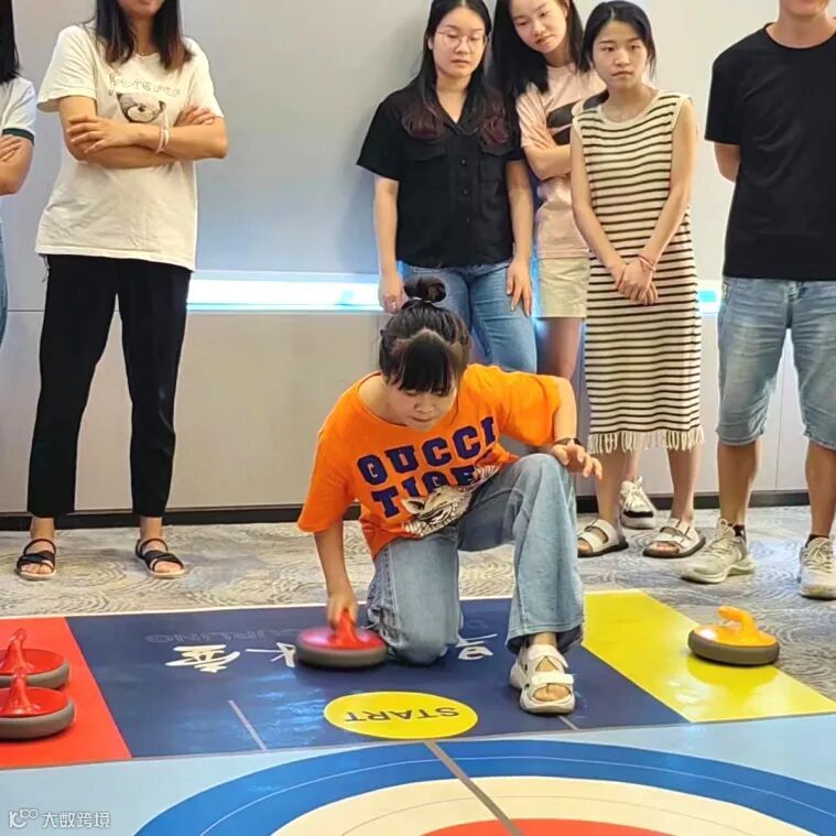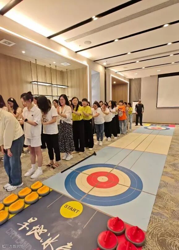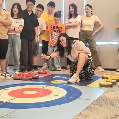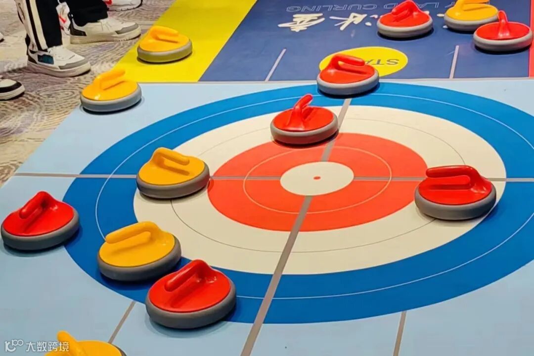 ladies and gentlemen,欢迎来到旱地冰壶现场,场上是 三羊开泰队和势不可挡队 ,势不可挡队第一波很遗憾,没有进得分区,险进防守区,只能先防守一波,三羊开泰队此时抓住机会疯狂得分,游戏进入高潮啦~三羊开泰队仍然领先两分,胜利就在眼前!!!