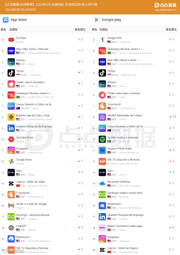 六月拉美地区非游应用收入冠军仍然为谷歌官方办公应用《Google One》,其在Google Play单平台预估收入超965万美元继续保持领先优势。App Store非游应用收入榜头名则同样为视频应用《YouTube》继续蝉联,其单平台预估收入约为300万美元。