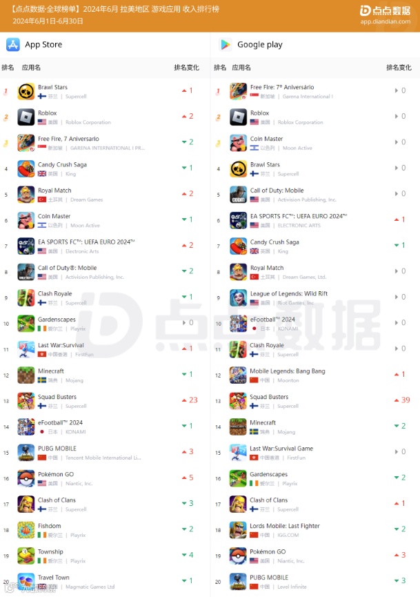 统计周期内,拉美地区手游收入冠军由元宇宙游戏平台《Roblox》超越《Free Fire》夺得,其六月预估总收入超过670万美元,后者则是以微弱领先继续蝉联Google Play手游收入榜冠军。
