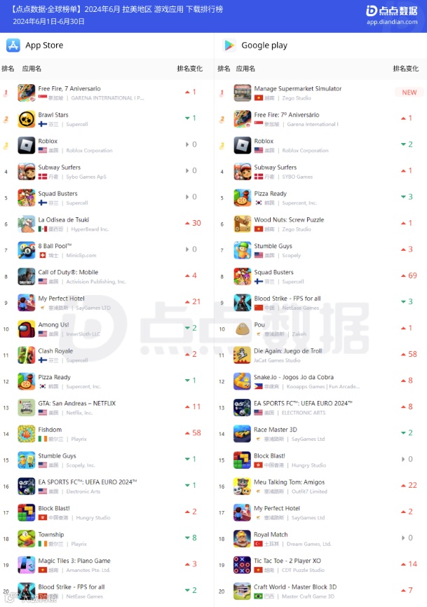 六月拉美地区手游下载冠军由越南Zego Studio出品的全球爆火热门模拟器游戏题材“超市经理模拟器”手游《Manage Supermarket Simulator》一举摘得,上月该游戏在拉美地区Google Play单平台下载量便超过647万。而App Store手游下载冠军则由Garena旗下大逃杀FPS动作手游《Free Fire》夺得,且该游戏上月在双平台的下载量皆有提升。