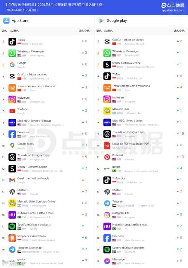 统计周期内,六月拉美地区非游应用下载冠军由短视频社交应用《
