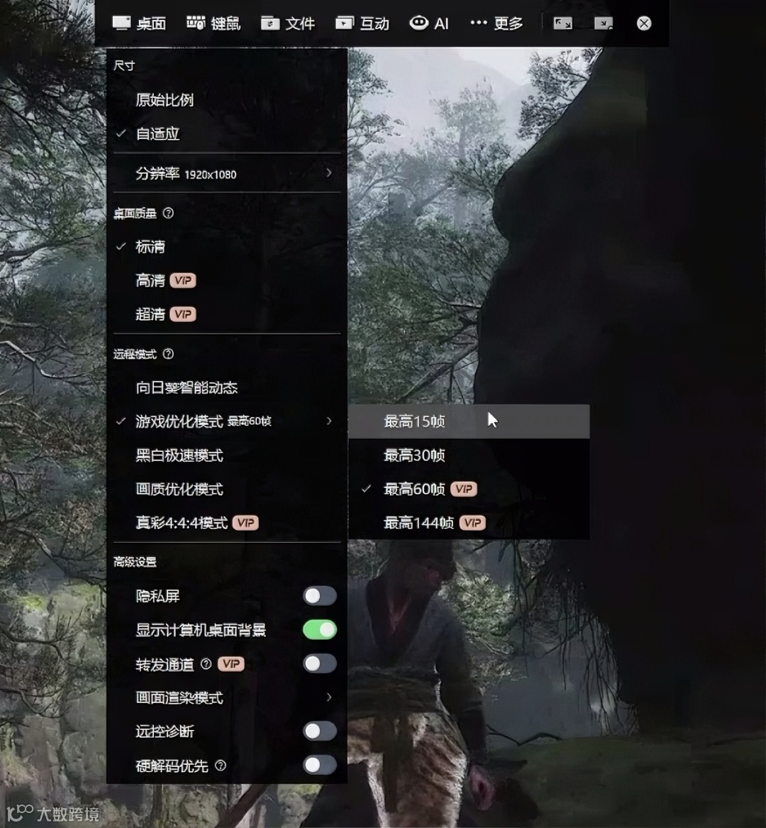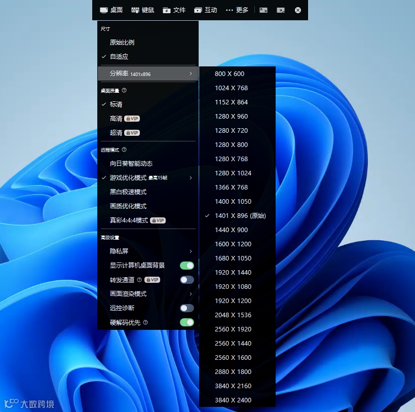 在远控过程中,你可通过顶部菜单自由调整分辨率、画质和远程模式。