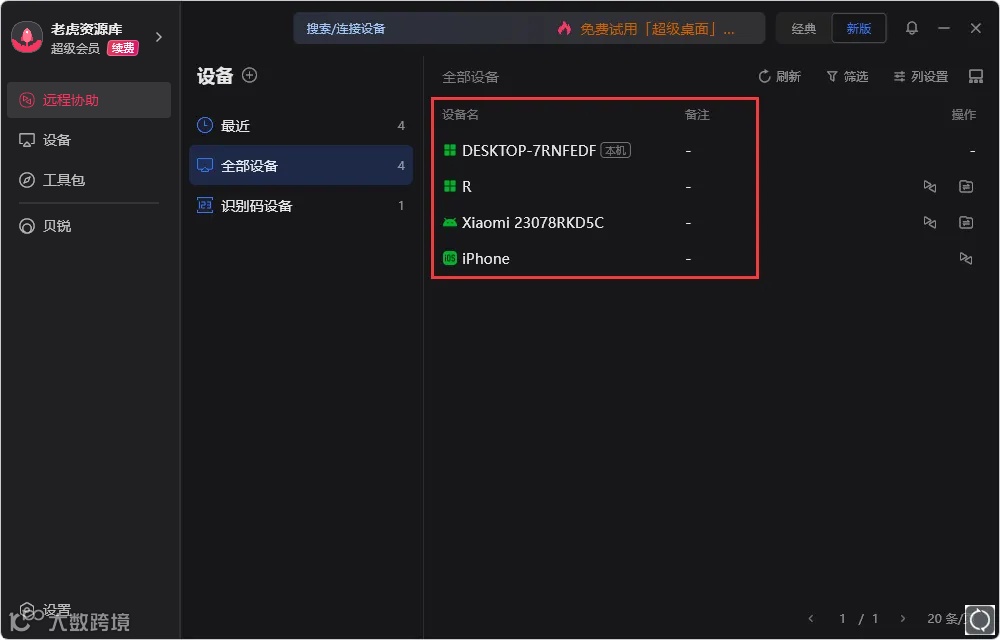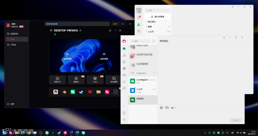 登录后,就可以看到账号下绑定的全部设备,然后你就可以在一端任意控制另一端的桌面、摄像头、文件传输等地方!