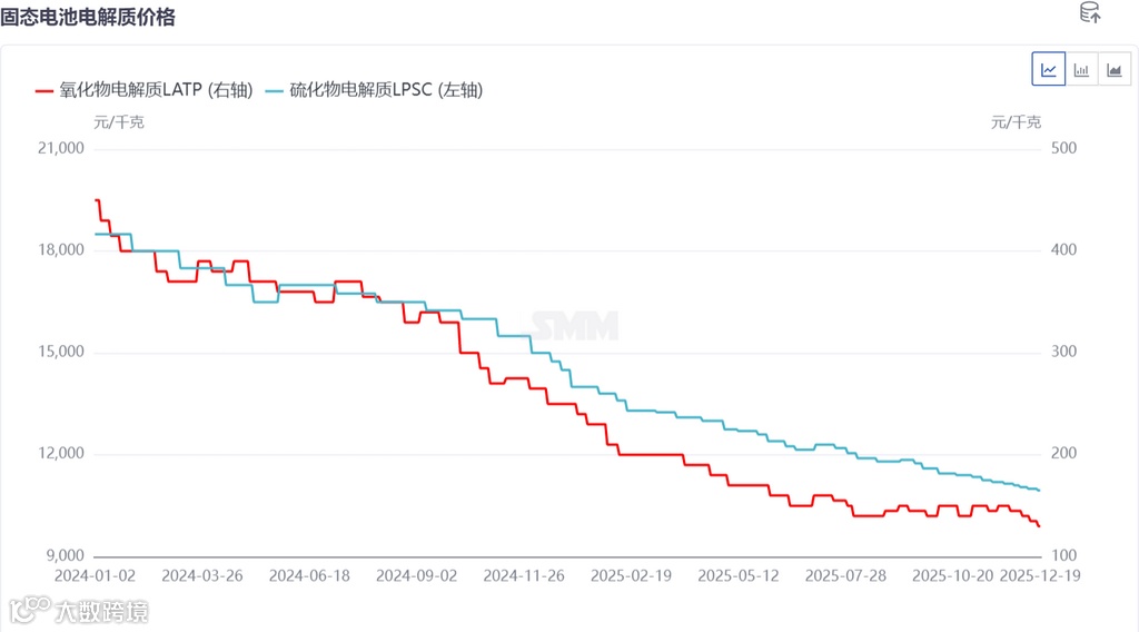 本周(2025年12月12日-18日)产业动态显示,固态电池已突破长期概念孵化阶段,正进入以“材料量产验证”和“整车应用锚定”为双引擎的产业化临界点。行业核心矛盾正从“能否做出样品”转向“能否实现稳定、经济且符合车规要求的规模化生产”。上游原料价格维持小幅下行趋势,硫化锂、LATP、LPSC等关键材料价格均有所回落,出货量保持稳定,目前主要需求集中于下游验证与小批量电池样品应用。