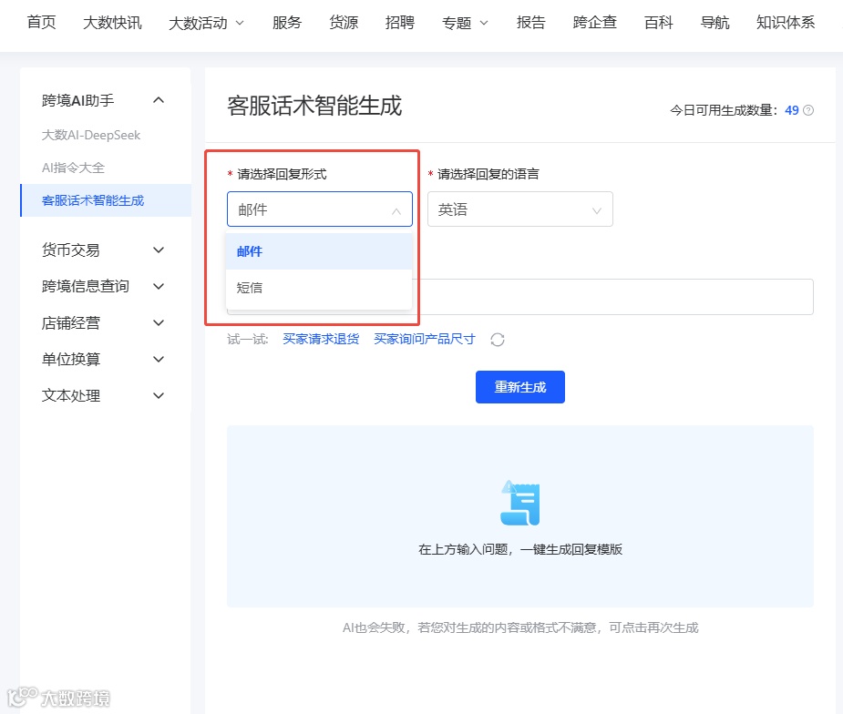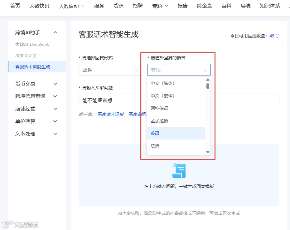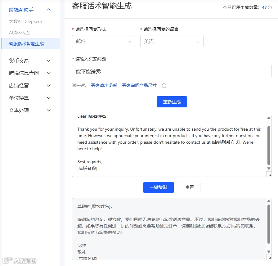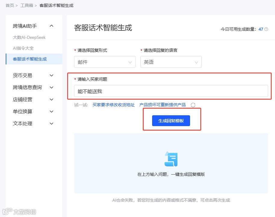 各位跨境朋友们,大家有没有遇到客户提出一些奇奇怪怪的问题?比如“我没下单,但是我的包裹为什么还没到?”,或者“如果我在火星你们可以帮我送到吗”等等,大家对此类问题会感觉头疼不知道怎么回答吗?不用担心,你们的好朋友大数来了!快来看看大数新上线的【客服话术智能生成】小工具吧!