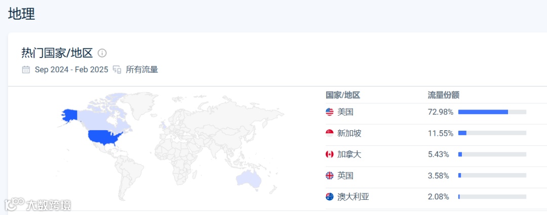 图源:Similarweb地理分布方面,美国为核心市场,贡献了72.98%的流量,新加坡(11.55%)和加拿大(5.43%)为次要市场,其余流量主要来自英国、澳大利亚等英语国家,表明业务以北美和亚太英语区为主要目标市场。
