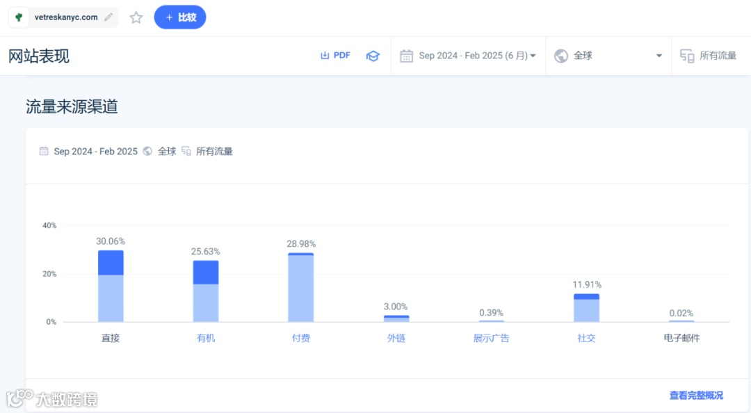 图源:Similarweb独立访客月均12148人,显示用户粘性较强。流量来源多元化,涵盖直接访问、有机搜索、付费广告、外链、展示广告、社交平台和电子邮件,反映了市场推广策略的多维度覆盖。