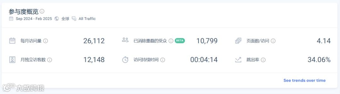 每月平均访问量为26,112次,每位访客平均浏览4.14个页面,单次访问时长为4分14秒,跳出率仅为34.06%,远低于行业平均水平,表明网站内容和用户体验较好,能够有效留住用户。