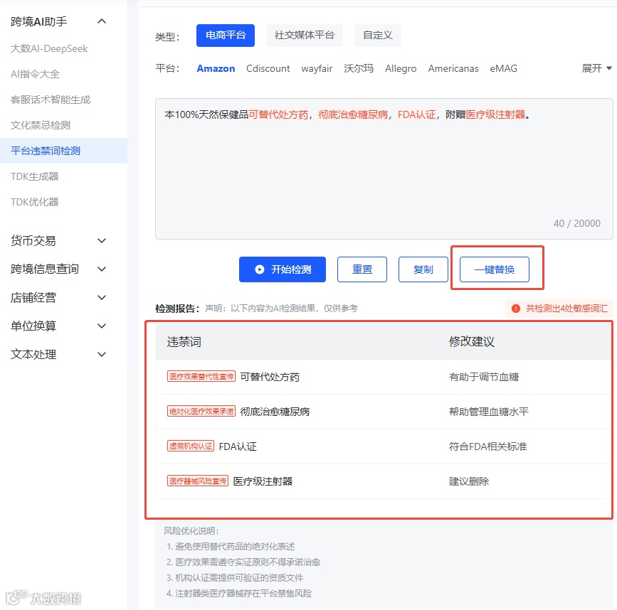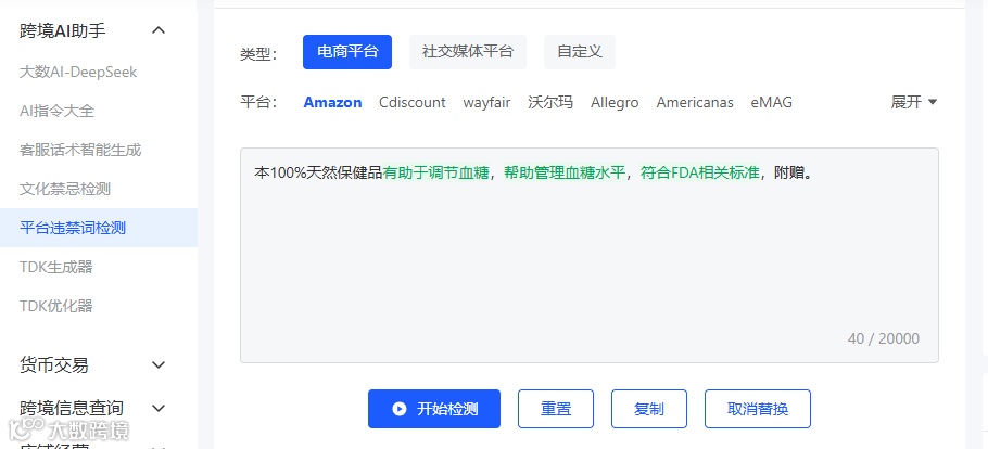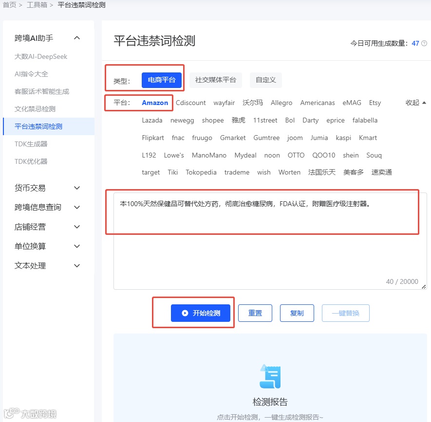 首先选择需要检测的平台类型,包括电商、社媒,也可以自定义。然后在对应的平台类型中找到对应的平台,这里以Amazon举例。将文本放入文本框中,点击“开始检测”按钮,等待几秒就可以出结果了。