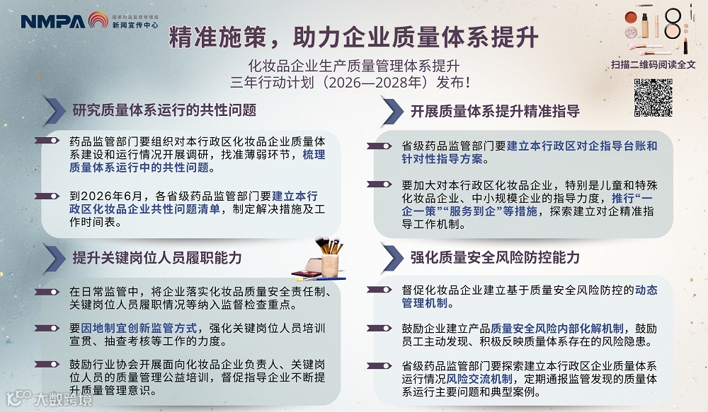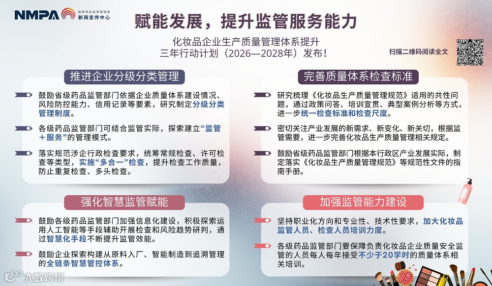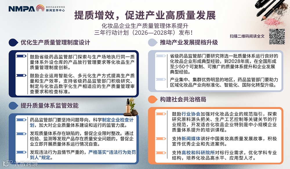 近日,国家药监局公布了《化妆品企业生产质量管理体系提升三年行动计划(2026—2028年)》,进一步提升了化妆品企业的质量体系运行水平,保障公众用妆安全,助力化妆品产业高质量发展。计划要求到2028年底,化妆品企业主体责任意识全面增强,质量体系运行水平整体提升,企业关键岗位人员履职能力显著提高,企业质量安全管理水平和风险防控能力持续优化,化妆品监管专业化水平不断加强,企业负责、政府监管、行业自律、公众参与、媒体监督、法治保障的社会共治格局基本形成,化妆品行业创新力、竞争力、品牌力明显提升。