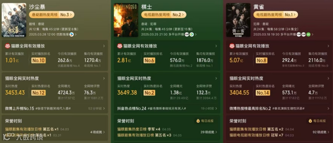 台网双端播出的《黄雀》,在台端最高收视率破2,网端历史最高热度为8638;《沙尘暴》在3月31日达成优酷站内热度破6500,猫眼日榜最高热度第五名;《棋士》4次拿下猫眼专业版电视剧热度榜日冠,在腾讯视频站内热度26376。本质上,三部剧的成绩并没有拉开太大距离。