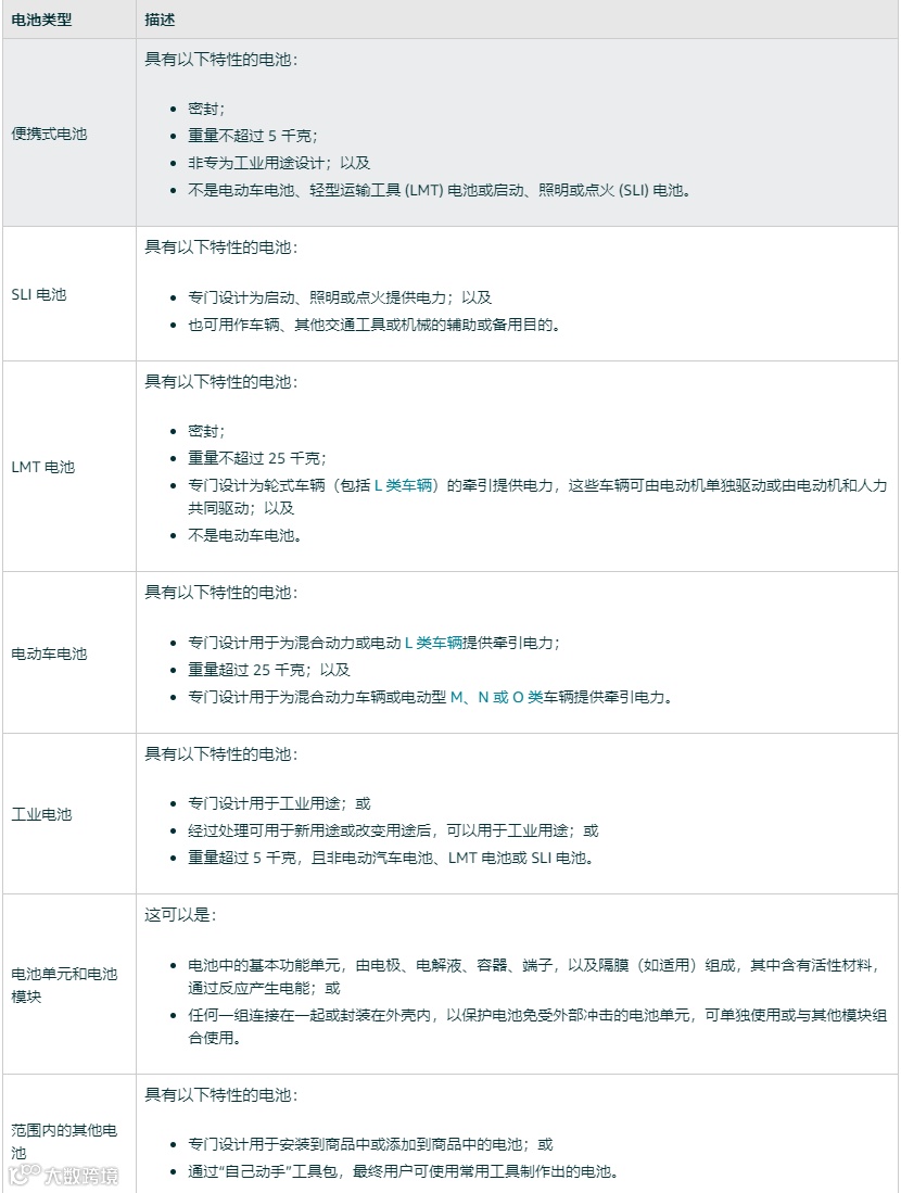欧盟电池法规将“电池”定义为:任何将化学能直接转换为电能的装置,具有内部或外部存储,由一个或多个不可充电或可充电电池单元(模块或电池组)组成,包括经过处理可以再次使用、经过处理可用于新用途、改变用途、重新制造的电池。