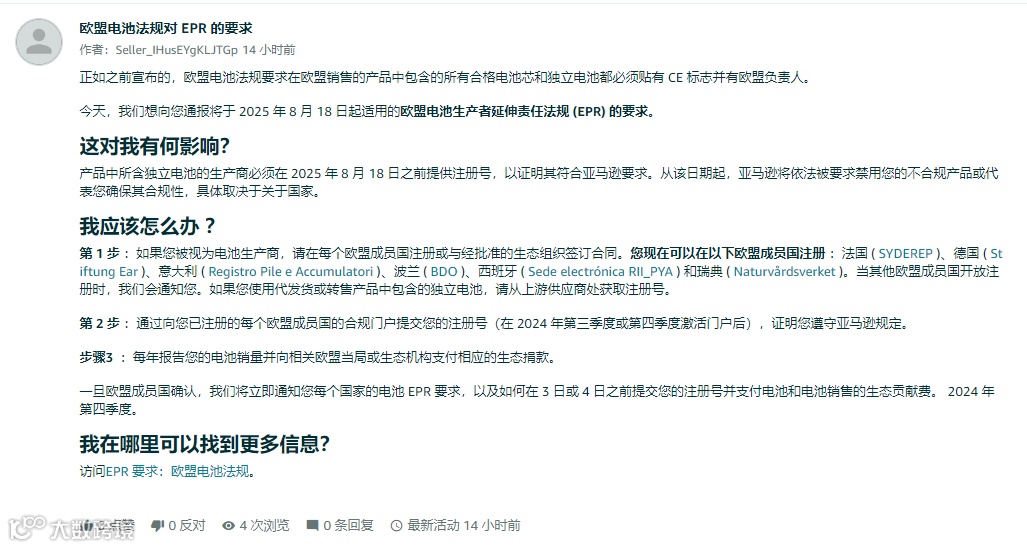 近日亚马逊欧洲站发布新欧盟电池法规对生产者延伸责任法规(EPR) 的新要求,公告如下: