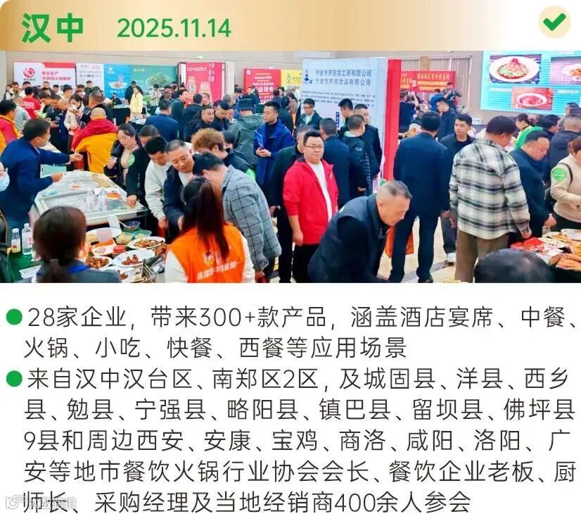 “城市行”依托海名餐博会 14 年餐饮全产业链的资源沉淀,搭建起在各地市餐饮对接的高效桥梁。截至目前,2025年“城市行”活动已在银川、兰州、宝鸡、汉中、遂宁、南充、内江7站成功举办。12月26日,活动还将继续走进甘肃庆阳,持续撮合产业链上下游供需精准对接、资源高效匹配,“城市行-庆阳站”展位数量同样有限,诚邀全国优质供应链商家携手共探下沉市场增量空间!