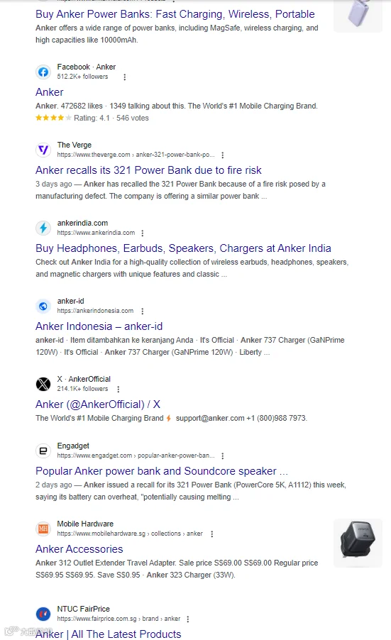 在图片中可以看到,谷歌收录的范围非常广,几乎是涵盖了全网的内容资讯。其中包括电商平台、品牌官网、社媒平台以及各类知名博客网站。Anker的谷歌搜索结果中,由知名科技网站发布的稿件占据非常大的比重,行业顶级媒体的作用则是利用媒体权威信用背书,塑造真实可信的品牌形象。