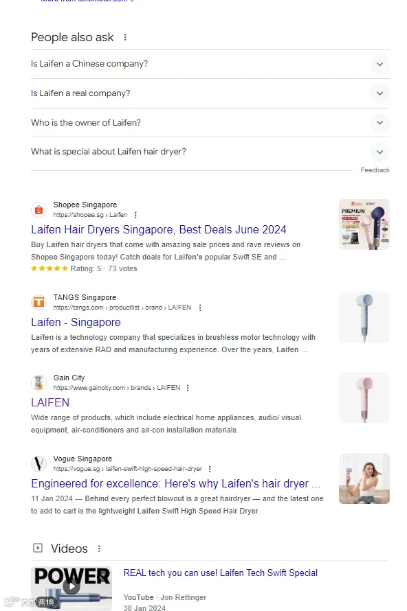 近年中国出海大热的品牌中,还有徕芬这样的小家电品牌。反观徕芬的谷歌搜索结果,发现其构成模式与Anker展现出了高度的不同。徕芬的搜索结果仅有两部分组成,电商平台购买链接占据80%,其次则是20%的媒体推荐内容。处于出海初步阶段的品牌,仅由电商平台页面吸引消费者是远远不够的。
