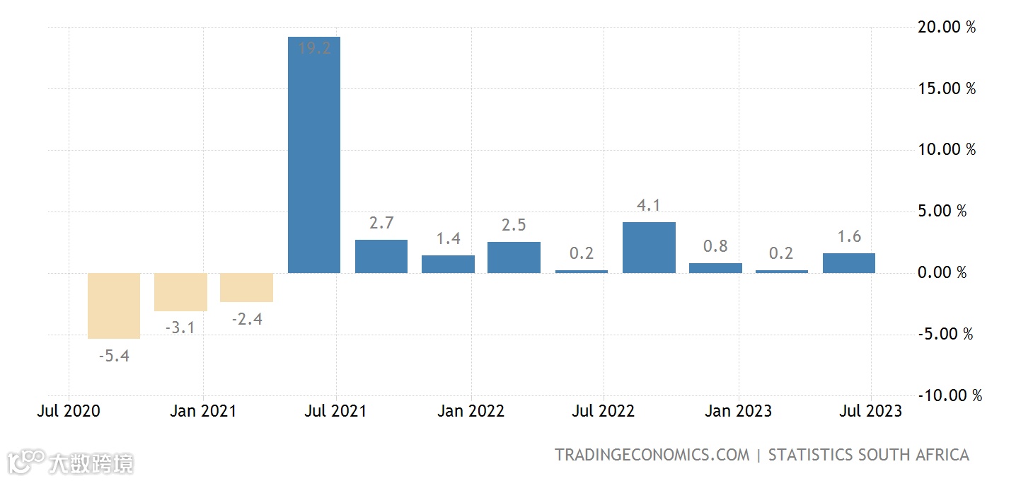 数据显示,南非今年第一季度的国内生产总值 (GDP) 在2023年第一季度增长了0.4%,勉强躲过了技术性衰退,季度和年度增长率均符合经济学家的预测。尽管持续限电和持续的电力危机,一季度制造业增长1.5%,对GDP增长贡献0.2个百分点。第二季度实际国内生产总值(GDP)增长0.6%。经济供给侧六大行业实现增长,制造业和金融业增长动力较大。在需求方面,南非受益于机械设备投资的急剧增加,其中包括与可再生能源相关的产品。