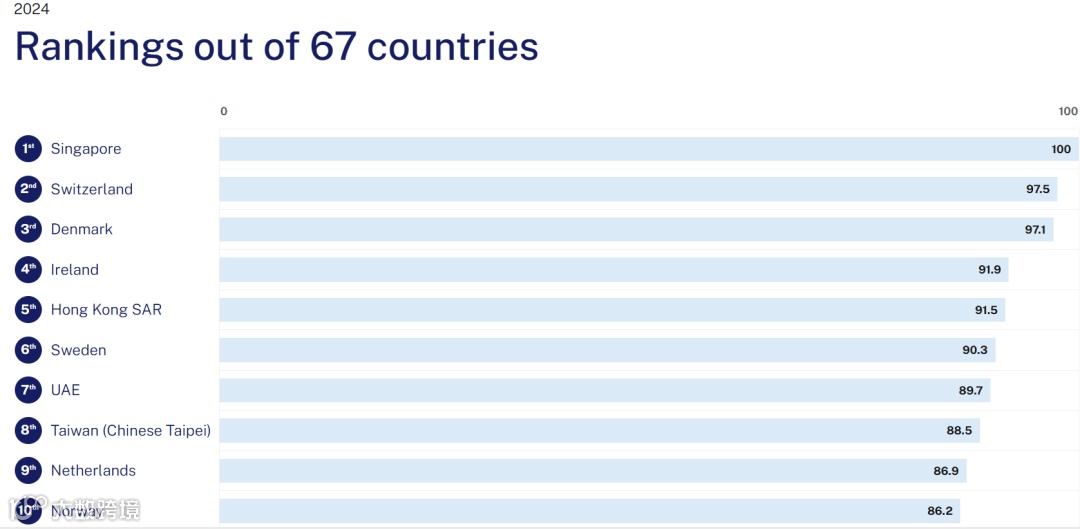 新加坡在2020年至2023年短暂跌出榜首(但仍在前5名之内)后,时隔四年重登榜首,瑞士位列第二,丹麦第三,爱尔兰第四,中国香港则提升两个位置到第五位。此外排名前十的经济体还包括瑞典、阿联酋、中国台湾、荷兰、挪威。
