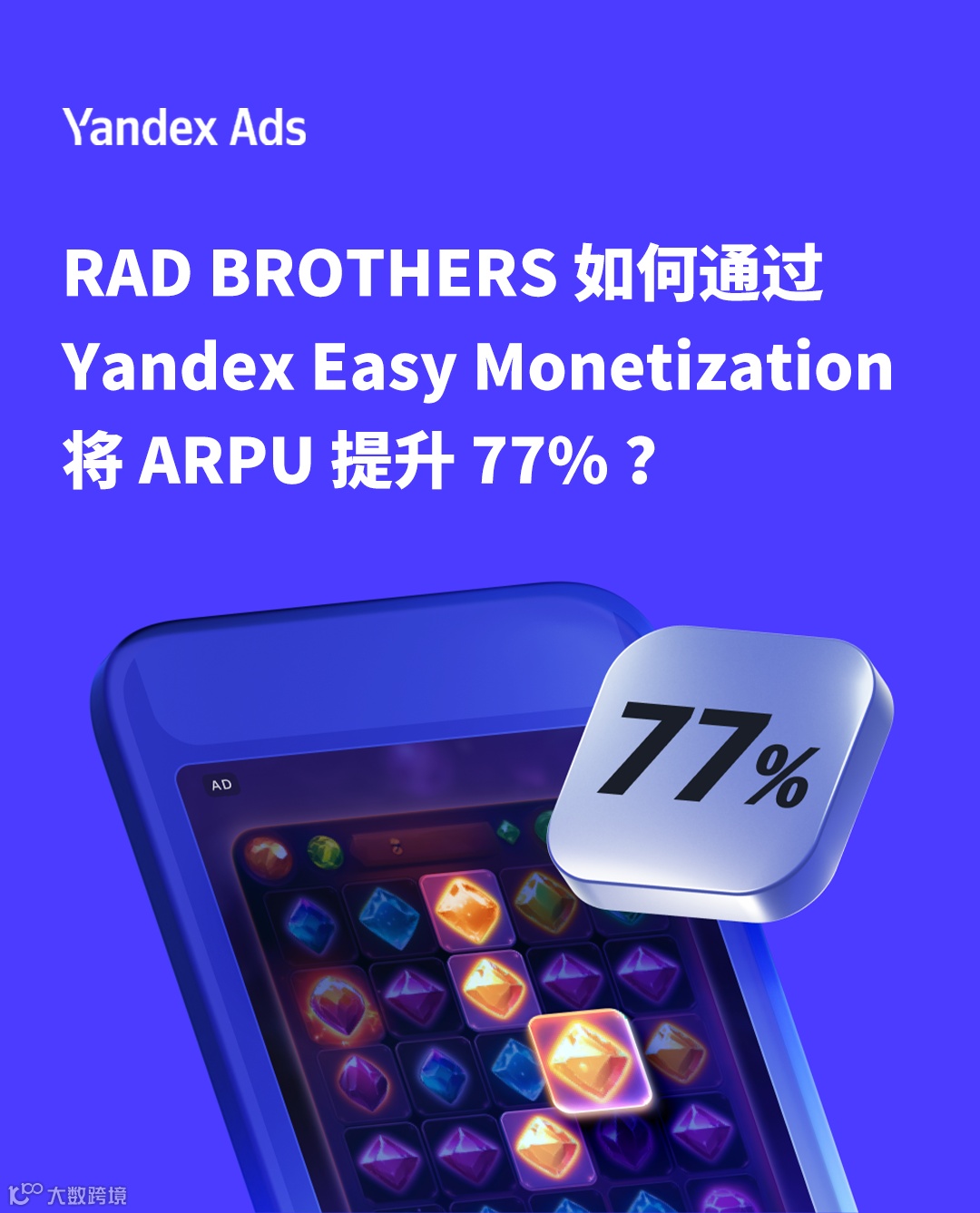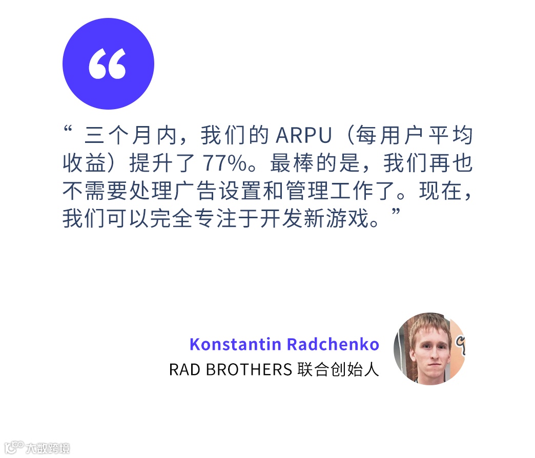 来自东欧的独立游戏工作室RAD BROTHERS通过与Yandex Easy Monetization合作,在仅4天内完成平台接入,三个月内实现每用户平均收入(ARPU)提升77%,为中小开发者提供了高效可复制的变现升级路径。