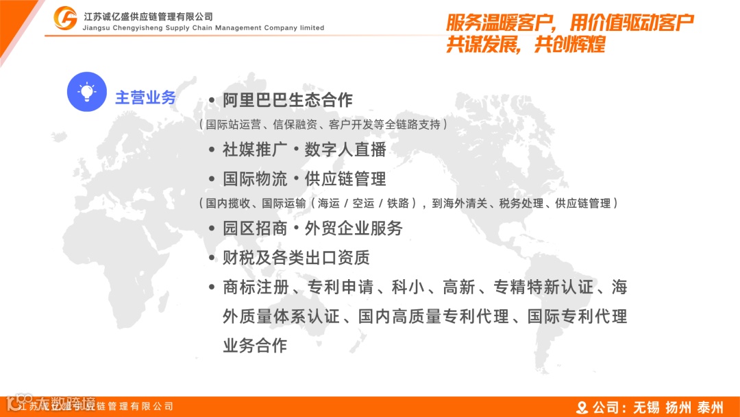关注江苏诚亿盛带你探索更多外贸增长方案,作为阿里生态深度合作的外贸全链路服务商,江苏诚亿盛初心永不改变,以“数字人直播获客+国际物流通关+财税资质代办+园区招商赋能”的一站式解决方案助力外贸企业省心出海、订单倍增~。江苏诚亿盛期待与您共同前行,共创美好未来!