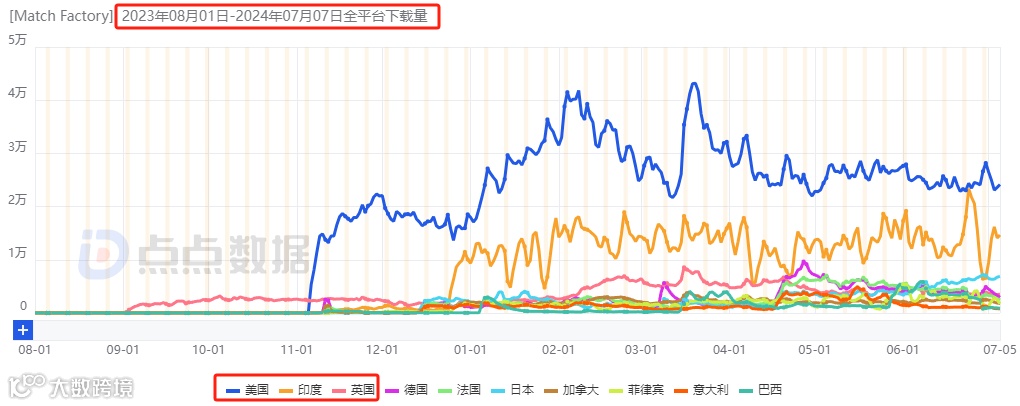 截至目前(7月5日,下同),该作的累计下载量预估达1690万(App Store占比56.28%),其中美国、印度与英国分别以36.91%、15.11%、6.42%的贡献位列TOP3。值得注意的是,从上个月开始,日本市场的日均下载量明显增加,目前仅低于美国和印度。