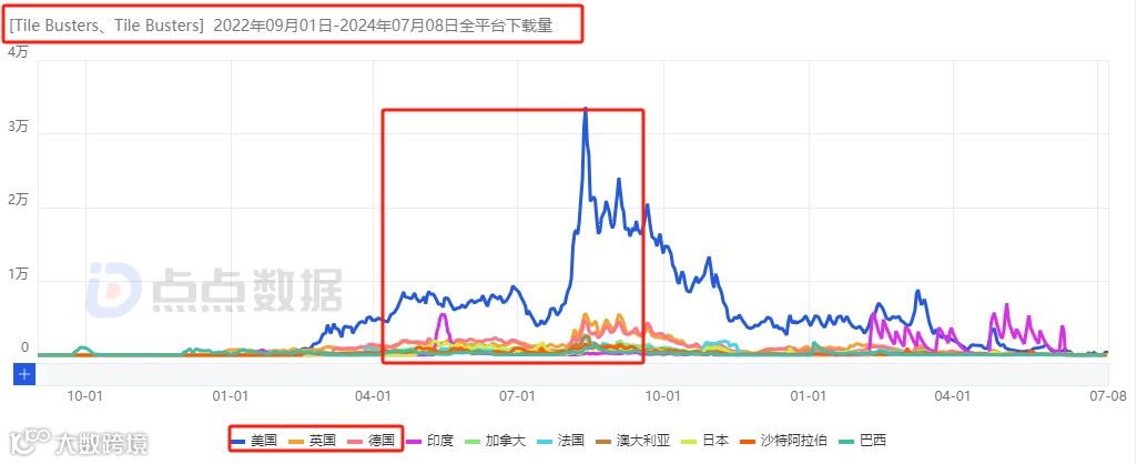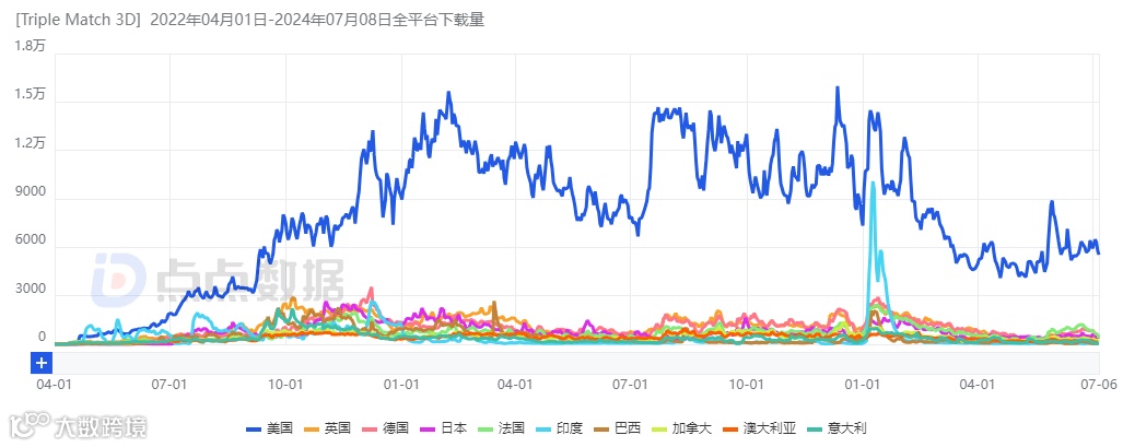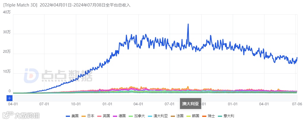 据点点数据显示,该作双端总流水应该已经达到8.62亿元,其中美国占比高达64.88%位列TOP1,英国及德国以5.2%、5.19%的贡献分居二三名。值得关注的是,2023年该作斩获2.03亿元,是紧随《Triple Match 3D》之后该年年收入第二高的堆叠消除游戏。