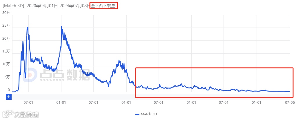 从下载量来看,《Match 3D》上线的第一年月下载量一直处于震荡波动中,但该段时间内,其月下载量最少也在250万附近,2021年1月甚至到达了671万的峰值,之后开始持续下降,当前月下载量已经不足10万。