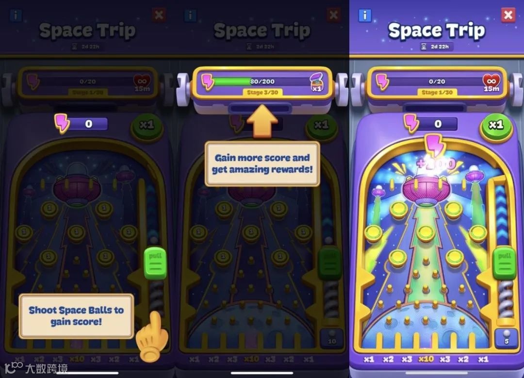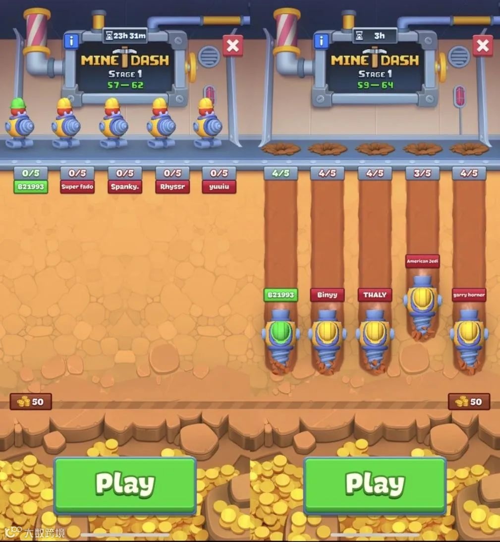 最后是提升流水、留存、活跃上的设计。游戏会在100关之后,每隔10至15关遇到一个超级关卡,同时200关之后将解锁物品包(可以理解为物品皮肤,之后每50关解锁一个新物品包,无法内购),本质上就是利用物品包帮助玩家建立线性目标的同时,利用难度不断提高的关卡促进变现,但由于变现节点靠后,玩家忠实度已经在前期不断验证过,因此玩家对“逼氪”的反感度会明显下降。另外,增添具备竞技与社交元素的PVP限时活动也非常重要,例如该作中的“Mine Dash”以及“Space Trip”。