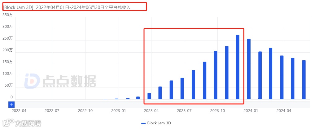 点点数据显示,《Block Jam 3D》虽然在2022年4月便开始规模性测试,但实际上其在去年3月才开始逐渐加大投放力度,2023年9月游戏月流水首次突破千万(1160万元),12月达到1990万元的月流水峰值,目前该作月流水稳定在1200万元左右。截至目前,该作总流水为1.82亿元,美国以61.67%的贡献居于首位。