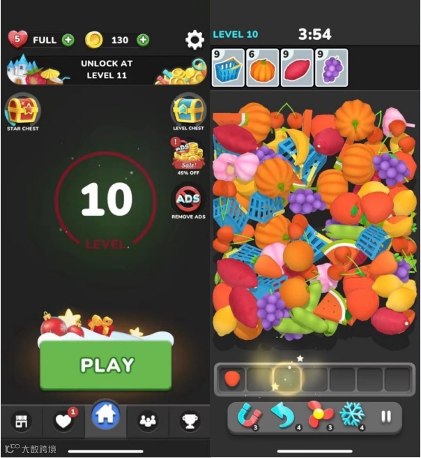 紧接着是在游戏难度的设置上。《Triple Match 3D》到30关之后玩家便能体会到挑战性,《Match Factory!》则需要到40关以后难度才会有一定提升。此外,后者还会随机掉落增强道具,前者只能积攒星星开箱以及内购。