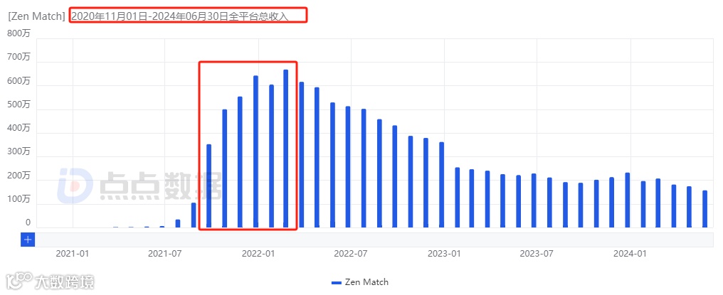 2020年11月中旬,由Good Job Games研发,Moon Active发行的《Zen Match》登陆Google Play,次年7月其上线App Store,同年10月(2600万元)开始游戏流水开始快速升高,直到2022年3月来到4900万元的月流水峰值,此后虽然收入开始走下坡路整体较为平缓,截至上个月其依然保持着1143万的月流。