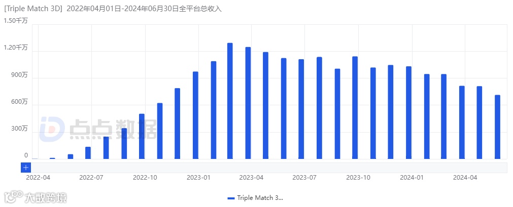 2022年4月中旬,《Triple Match 3D》上线Google Play,同年8月底登陆App Store,而8月该作在48万月下载量和几乎没有苹果端流水加持的情况下,月流水(该作为变现方式为混变化,文章内流水仅包含IAP收入,下同)已经达到了1810万元,随着流水的持续增长,2023年3月月流水达到9410万元的峰值。