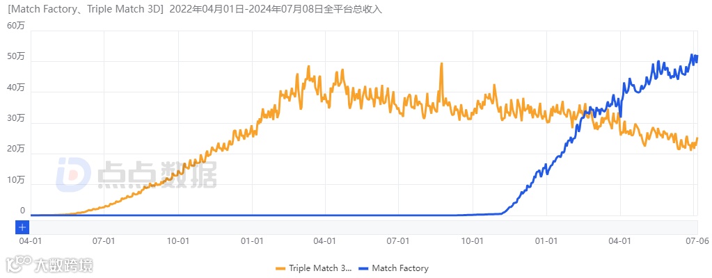 综合来看,目前堆叠消除赛道已经完成了从《Triple Match 3D》到《Match Factory!》“新旧王”的更替。